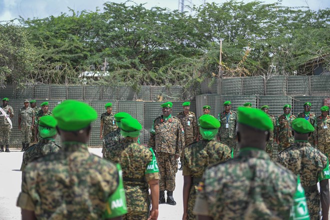 The newly appointed African Union Transition Mission in Somalia (ATMIS), Force Commander, Lt. Gen. Sam Okiding during a guard of honor mounted by Uganda Peoples Defence Forces (UPDF) troops serving under ATMIS at the Force Headquarters in Mogadishu, Somalia on 14 May 2023. ATMIS Photo / Mukhtar Nuur