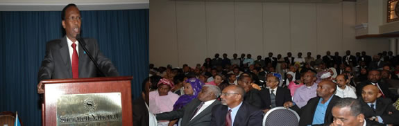 The Somali community in the greater Washington D.C. metropolitan area worked itself into an unprecedented patriotic spirit and energy in welcoming the PM. He stayed at a Four-Star Sheraton hotel, where people waited for hours on a workday, Monday night, just to get a glimpse of our nation’s newest hero. Equally, the U.S. government honored the PM in providing him the necessary security details that are only reserved for respected delegates from friendly allied countries. As the main event of that memorable evening commenced, there was a high level of exhilaration in all attendees’ eyes. It began with orchestrated speeches, poetry and buraanbur of some of the audience that went on into the wee hours of the night. One of the most ardent followers of PM Gedi’s was the genius Somali poet, Professor Mahamud Siad Togane, who that evening for close to an hour sang and chanted the praises and idolatry elevations of Gedi, like a deranged idol worshipper. It was a déjà vu all over again of another era, when all Somalis used to march to the wicked drumbeat of Siyad Barre’s tyrannical regime back in the 1970s. Afterwards, Gedi took to the podium and spoke for only few minutes that were paused with deafening applauses and patriotic chants. In his speech, he clearly outlined the daunting task that faces the TFG, and reiterated his personal commitment to see to it that he delivers the agenda of his government: political stability based on broad reconciliation, and an expedited reconstruction of the country’s infrastructure.