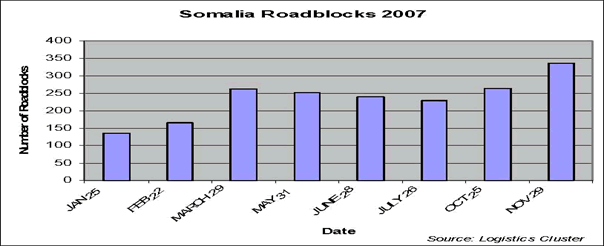 Ethiopian forces drove the Islamic Courts out of power in December 2006 and South Central Somalia regained its lawlessness. According to Swiss Peace, six months after the Islamic Courts was defeated 238 roadblocks appeared in South Central Somalia alone and after one year that number reached almost 340. The United Nations Office for the Coordination of Humanitarian Affairs (OCHA) noted in Dec 2007, “Ad hoc roadblocks that charge taxes ranging from US$70 – US$500 to move in and out of Mogadishu have caused huge hindrances to the humanitarian community in accessing vulnerable people. In November, Non-Governmental Organisations (NGOs) reported delays and payment of taxes of up to US$ 475 at eight roadblocks on the Mogadhishu/Afgooye road – a major area of humanitarian operations. The highest number of roadblocks since the beginning of 2007 – 336 in total – was recorded in November.” OCHA produced the following chart which shows the increase of roadblocks in Somalia in 2007.