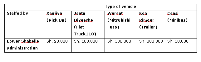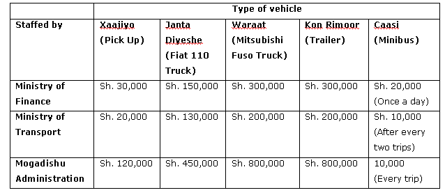This roadblock is about 15 km from Mogadishu and used to belong to Abdi Qeybdiid, the current commander of the Police Force. This roadblock is staffed by three separate groups – one from the Ministry of Finance, another from the Ministry of Transport and a third from the Mogadishu Administration. The mayor of Mogadishu is a former warlord. There are about 50 to 60 men at this roadblock and they charge different rates. The following table shows how much each group charges.
