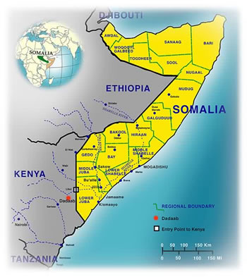 East Africa, (AKA) Horn Of Africa. Southeast of Djibouti, east of Ethiopia, northwest of Kenya, across from Yemen, on the southern bank of Gulf Of Aden, and the western bank of Indian Ocean,