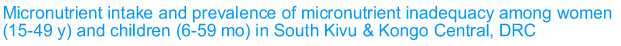 Iron inadequacy was highest in infants (6–11 m) at 82% and 64% in South Kivu and Kongo Central, respectively. Among older children (12–59 m) in both provinces, the prevalence of iron inadequacy was similar at ~20%. There was a high prevalence of inadequate zinc intake in women and children (i.e. 79–86% among WRA and 56–91% among children 6–59 m) consistent with our findings of a high prevalence of low serum zinc in the same sample. Dietary data here corroborate the low prevalence of biochemical vitamin A deficiency but not iron.